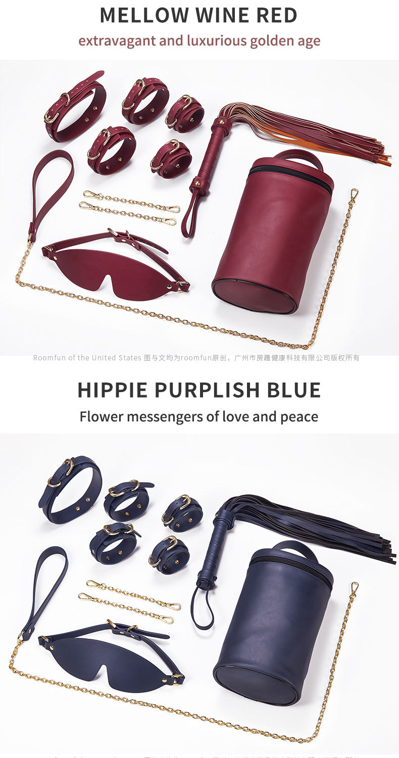 The wine red and purplish-blue colored bondage set of leather is in the form of SM handcuff ankle eye mask collar to give protocol of wish, and affection temperance. Its ring design is made in a way that stylish round feelings are perceived by round angle radian. Even wild traveling will not crash your skin. When you will hang down naturally then its suede soft texture, voice effects during flogging and softness with fingertips will give you more sexual feelings. This flower massager of peace and love is profligate and opulent golden in mellow wine red. The gold medal champagne is flat, improved solid, anti-allergy, anti-sweat, and anti-oxidation type. This will protect larger time with 16 fine processes and for hanging plating gloss.