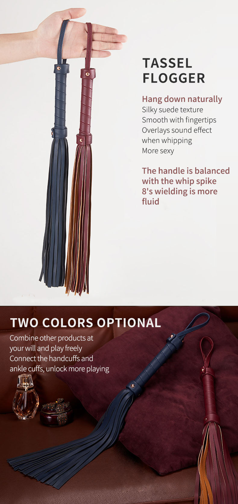 - Silky suede texture, Smooth with fingertips, Overlays sound effect, when whipping, Sexier, The handle is balanced with the whip spike 8's wielding is more fluid